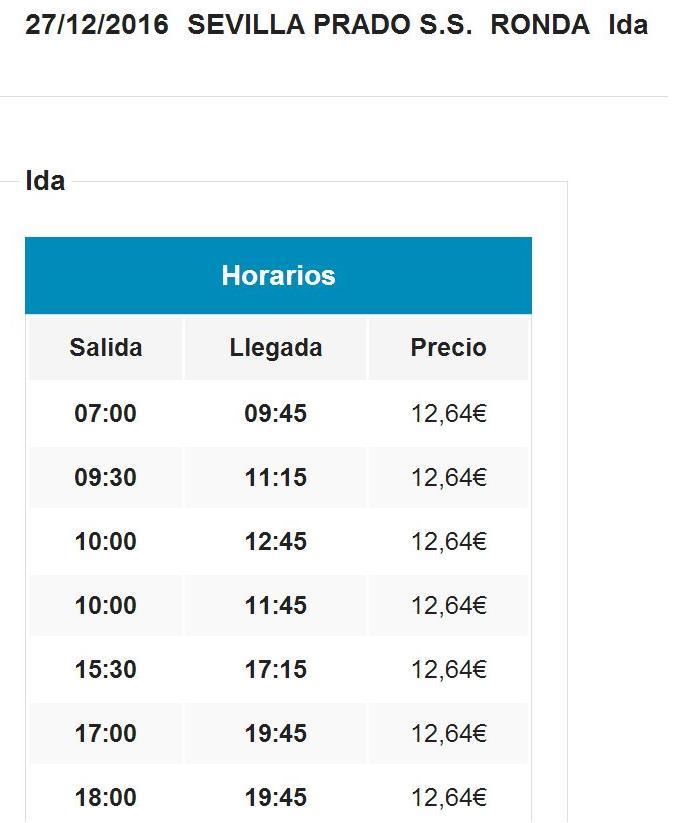 Автобусный перевозчик Los Amarillos ездит между городами несколько раз в день: 07:00, 09:30, 10:00, 15:30, 17:00, 18:00. Отправляются автобусы от автовокзала Prado de San Sebastián в Севилье, который находится на Calle Manuel Vázquez Sagastizabal. Через 1 ч 45 мин они прибывают на автобусную станцию Ронды (на Plaza de Concepción García Redondo). Я думаю, что для такого расстояния (130 км) это совсем не долго.