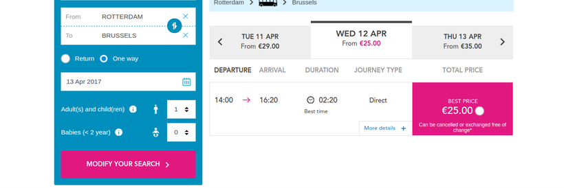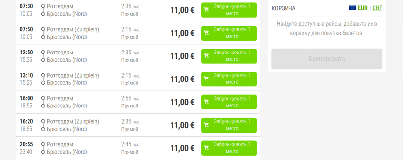 На скриншот не попал последний рейс, который отправляется в 21:20 с остановки Zuidplein и прибывает в Брюссель в 23:40.
