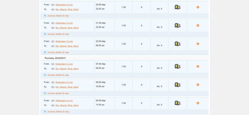 Это скриншот расписания с прямыми поездами. Скринить все рейсы я не стал, думаю понятно что начиная с 7 и до 22 часов поезда отходят с интенсивностью раз в час. Есть и поезда с пересадками, она делается в Антверпене. Мне такой вариант категорически не подходил, но если кому-то хочется, тот может учесть и этот вариант.