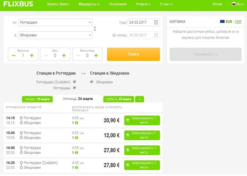 В холодное время автобусы фирмы Flixbus ездят между городами с одной пересадкой. Рейсов может быть от двух до четырех. Время в пути – 4-4,5 часа. Сравнивая с поездами, кажется, что это очень долго.