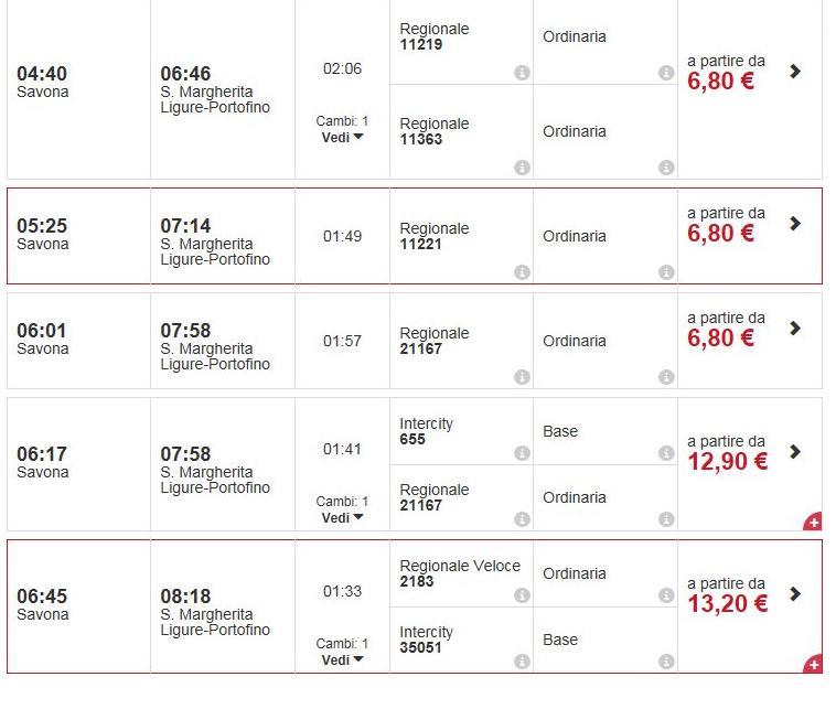 Поезда в этом направлении курсируют с 04:40 до 21:33 с интервалом от 7 минут до 1 часа. Есть рейсы с пересадкой в Генуе, но большая часть без пересадки. Добраться от вокзала Савоны (на Piazza Aldo Moro) до станции в Санта-Маргерите (на Via Fiume) можно за полтора-два часа, в зависимости от рейса. Обслуживают это направление как региональные, так и скоростные поезда. Подробнее о них и о железной дороге Италии можно узнать в этой статье.