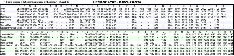 Автобусы перевозчика SitaSud совершают множество прямых рейсов между Салерно и Майори. Первый автобус отходит от остановки на Vinciprova в 05:55. Остановка эта расположена в 600 м от ЖД вокзала Salerno Centrale. Интервал между рейсами от 10 мин до 1 часа, а последний автобус выезжает из Салерно в 21:30. За 55 мин можно доехать до Maiori Centro. В городе есть еще одна остановка Erchie, не доезжая до центральной. Из окошка автобуса открываются красивые виды, но на маршруте множество поворотов, и может укачать.