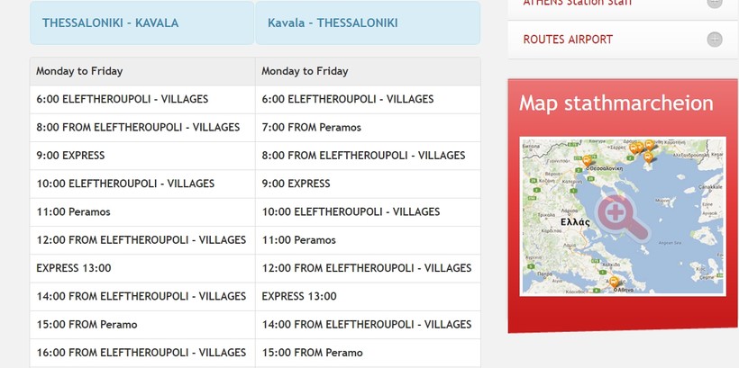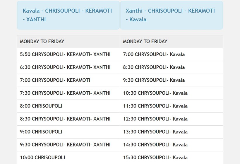 График движения можно посмотреть как на автостанции Салоников, так и на сайте компании, занимающейся перевозками пассажиров по такому маршруту — это КТЕL Kavalas.