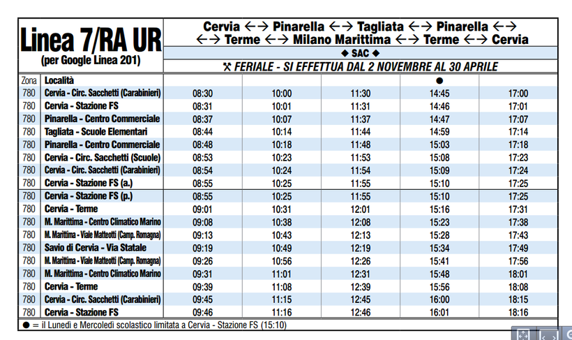 Выйдя из здания вокзала, можно выбирать на какой именно автобус сесть. Есть автобусы, отходящие непосредственно от железнодорожного вокзала, расположенного по адресу Cervia, Viale della Stazione 38. Это автобусы линии 201 все той же вышеупомянутой компании Start Romagna. С их расписанием также можно ознакомиться на сайте компании и на скриншоте внизу: