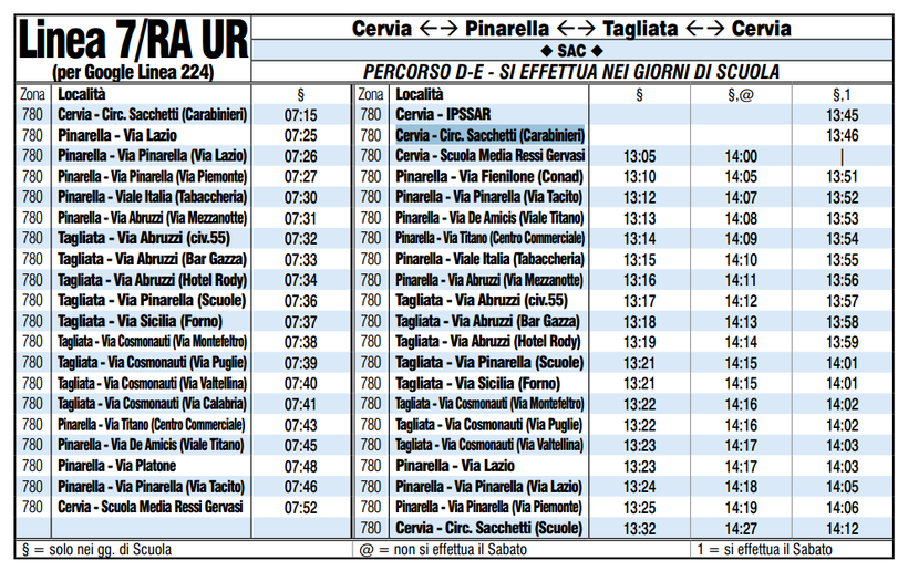 Как видно, автобусов не слишком-то много, правда летом их бывает и побольше, поэтому крайне рекомендую уточнять расписание на сайте, планируя путешествие. Прибывают автобусы данного маршрута на остановку Pinarella Centro Commerciale рядом с береговой линией по адресу V.le Titano, 82, 48015 Cervia RA.