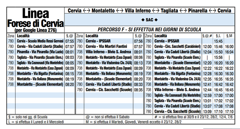 Другой автобус имеет номер 276 и отправляется от местного образовательного учреждения, располагающегося по адресу 16 Via Caduti Per La Liberta', Cervia, Ra 48015. Это также недалеко от железнодорожного вокзала, нужно лишь немного пройтись. С графиком движения автобуса можно ознакомиться на скриншоте, расположенном ниже: