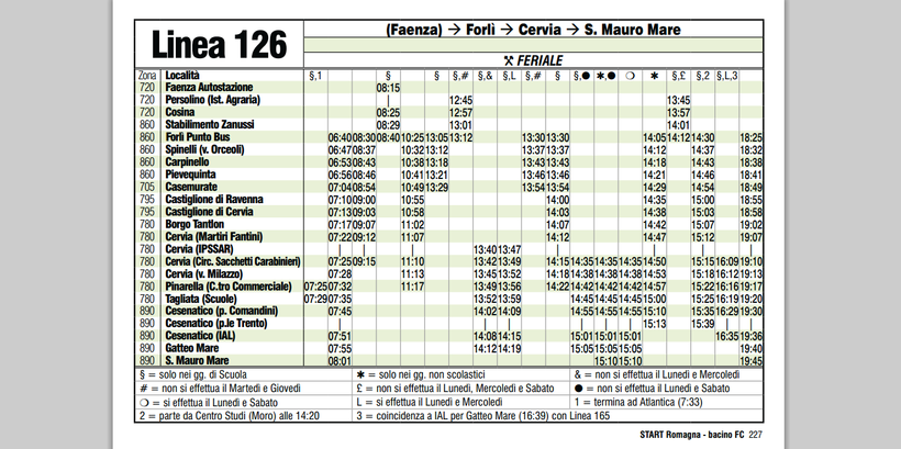 Приехав на вокзал, нужно выйти и искать автобус компании Start Romagna под номером 126. С его расписанием можно ознакомиться на сайте компании или чуть ниже: