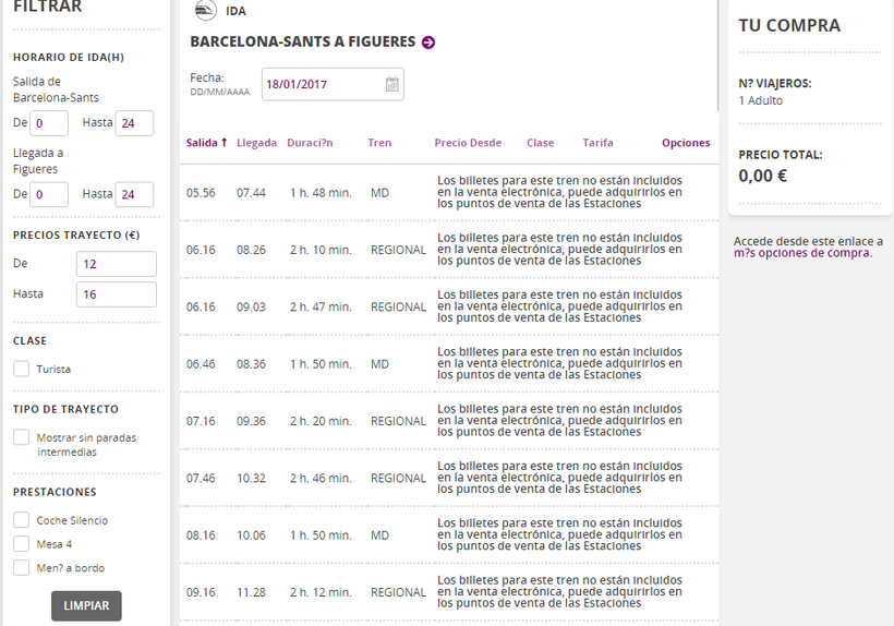 Если у вас нет машины или нет желания ездить на машине, то у меня плохие новости – прямых рейсов из Салоу в Фигерас нет. Что бы вы ни выбрали – поезд или автобус, в любом случае придётся пересаживаться в Барселоне. Проще всего, на мой взгляд, добраться в Фигерас на поезде. С непривычки могут возникнуть трудности с покупкой билетов через автомат или с выбором правильного поезда, но в целом ничего сложного, а о подробностях железнодорожного движения в Испании можно прочитать в соответствующей статье. С железнодорожной станции Салоу (она в городке только одна) можно доехать до вокзала «Барселона Сантс», по этому маршруту ходят и поезда и простые электрички, дорога занимает полтора часа. На вокзале «Барселона Сантс» нужно пересесть на поезд в Фигерас. Дорога из Барселоны в Фигерас занимает от одного до трёх часов в зависимости от того, какой поезд вы выберите.