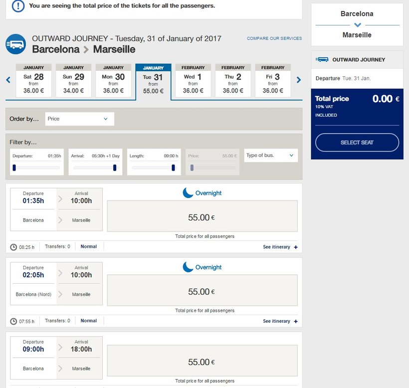 За проезд в автобусе в Барселону можно рассчитаться с водителем. А вот билеты в Марсель можно купить в кассе автовокзала Барселоны, откуда будет проходить поездка, или на сайтах ALSA и Eurolines.