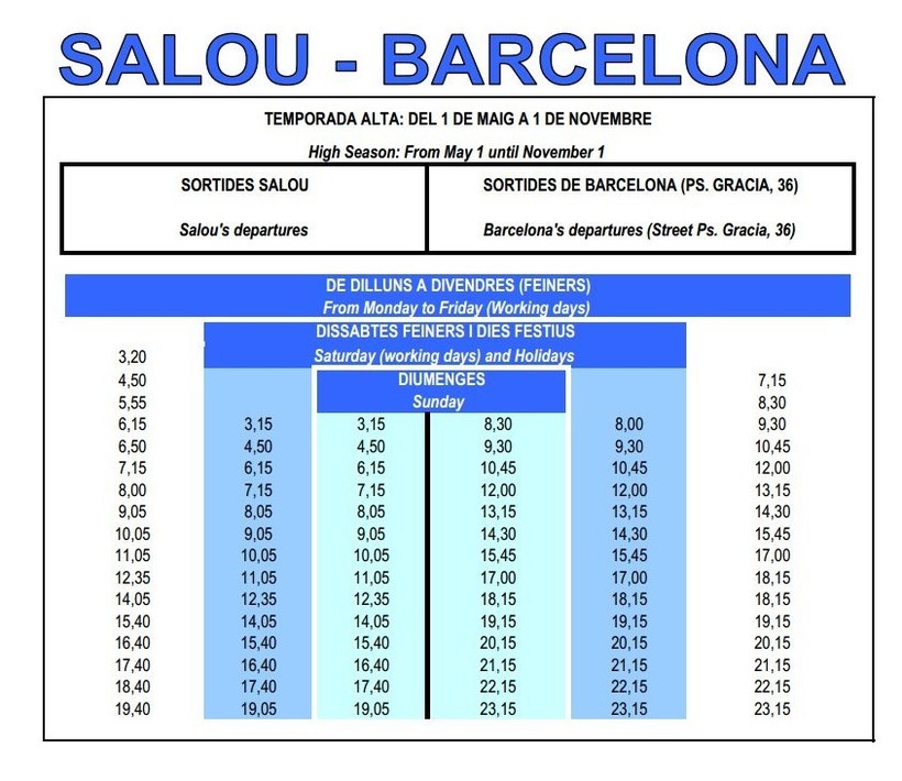 И так, по маршруту с пересадкой подробнее:Из Салоу в Барселону можно добраться на региональных автобусах от компании Plana. Автобусов очень много, курсируют они с интервалом от получаса до часа, точнее расписание можно посмотреть здесь. Ехать придется даже менее получаса.