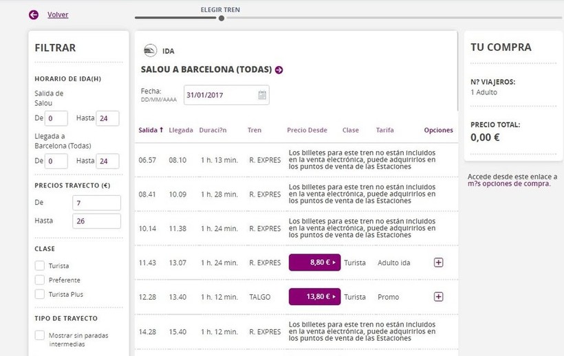 Покупку билетов на некоторые поезда в Барселону можно осуществить онлайн, некоторые продаются исключительно в кассе или терминале в помещении самого ж/д вокзала Салоу.Купить проездные из Барселоны в Марсель можно здесь.
