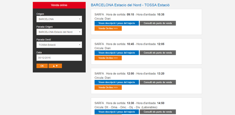 Дорога в Тосса Де Мар общественным транспортом так или иначе приведёт в Барселону на автобусный рейс Барселона – Тосса Де Мар, так что следует выбрать только как добраться до самой Барселоны. Я бы выбрал поезд – у железнодорожников более понятный сайт, нежели у автобусной компании, да и билеты слегка дешевле, но решать вам. Кто знает, может кому-то принципиально не нравится ездить в поезде.