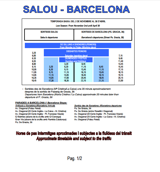 В любом случае, проще всего попасть в Тосса Де Мар на автобусе который едет с Северного вокзала Барселоны. Но в саму Барселону можно попасть не только на поезде. Между Салоу и Барселоной есть и автобусное сообщение. Автобусы из Салоу в Барселону отправляются с площади Европа с шести утра, каждый час выходит по одному автобусу. Кампания перевозчик называется «Plana», на её официальном сайте можно посмотреть подробное расписание рейсов. Путь в Барселону на автобусе «Plana» занимает полтора часа, конечная остановка называется «Passeig de Gràcia». Выйдя на конечной остановке нужно направиться на Северный вокзал, это не очень далеко (2,5 км) – можно дойти пешком, а там сесть на автобус до Тосса Де Мар, про который я уже рассказывал. Напомню, он отправляется с Северного вокзала каждые полтора часа и доезжает до Тосса Де Мар за 1 час 20 минут.