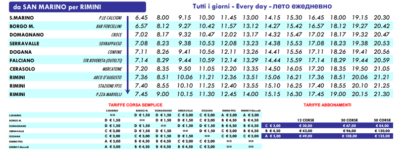 Все автобусы из Сан-Марино в Римини отправляются с площади Piazzale delle Autocorriere (ее еще называют Piazzale Calcigni). Перевозки осуществляет транспортная компания BonelliBus.