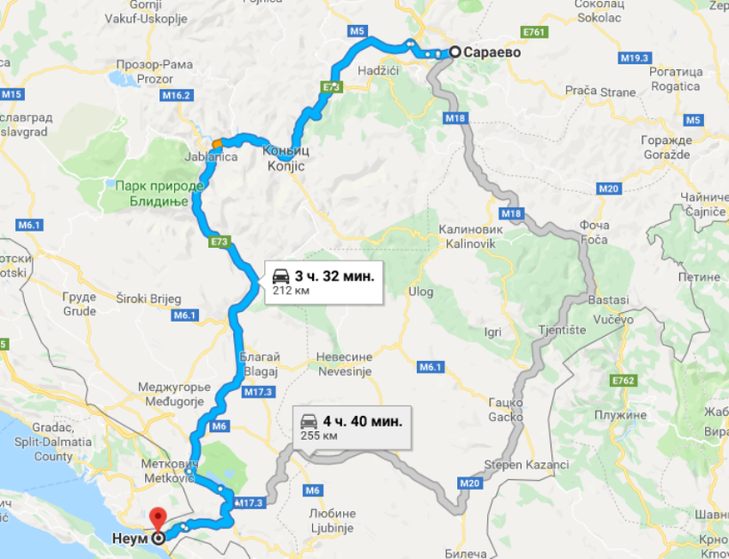 Сараево и Неум располагаются на расстоянии 212 км друг от друга, преодолеть такой путь на машине можно где-то за 3,5 часа.