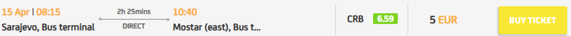 Ежедневно из Сараева в Мостар можно выехать на автобусе компании Globtour в 08:15. Путь до Мостара автобус проезжает за 2 ч. 25 мин.