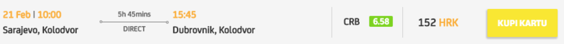 Ежедневно в Дубровник следует всего два прямых автобуса. В 07:15 отправляется автобус боснийской компании Centrotrans и преодолевает свой путь за 6,5 часов.