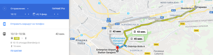 А в 10:00 из Сараева выезжает автобус хорватской компании Globtour и проезжает по своему маршруту за 5 ч. 45 мин.