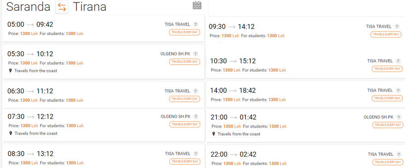 Ежедневно из Саранды в Тирану можно доехать автобусами компаний Olgeno Travel и Tisa Travel.