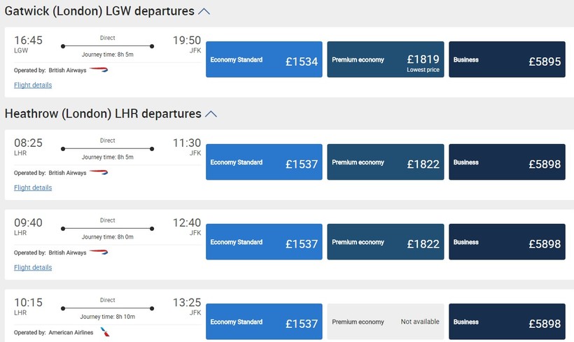 Из аэропорта Гатвик летают самолеты Norwegian, из Сити — British Airways, а из Хитроу — American Airline, Virgin Atlantic, United, British Airways. Самолеты приземляются в аэропорту Ньюарк Либерти и им. Дж. Кеннеди. Перелет длится 8-9 часов.