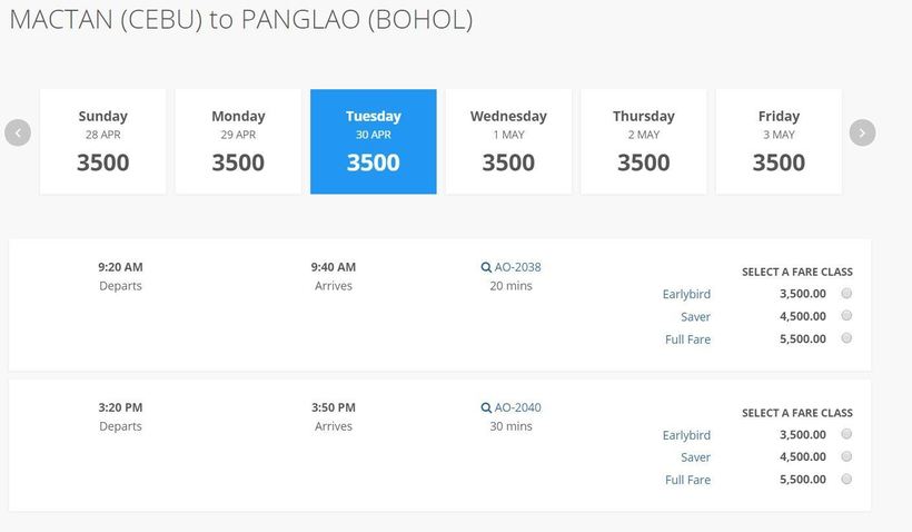 Но здесь предстоит воспользоваться не какими-нибудь большими самолетами, а маломоторной авиацией. Долететь на Бохол можно самолетами компании Air Juan. Вот скриншот с официального сайта компании: