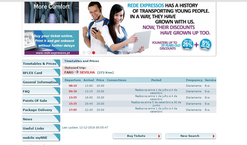 Билет на автобус можно купить онлайн на сайтах Eva, Rede Expressos и Alsa, а также в кассах автовокзала Фару.