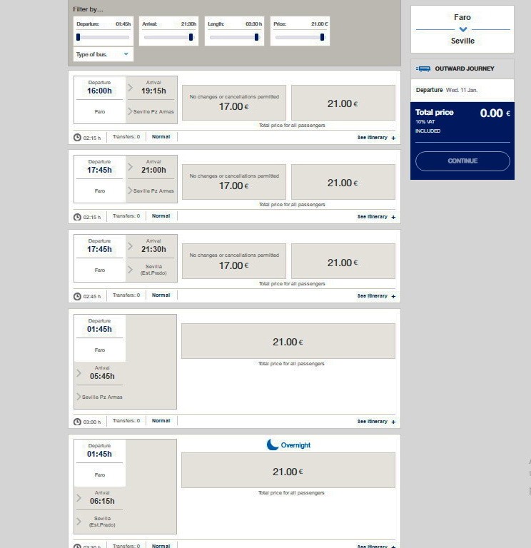 Стоимость билета на автобус португальской компании - 20 евро. Испанская компания предлагает билеты в Севилью от 17 евро за невозвратный билет до 21 евро за билет, который можно вернуть и обменять.