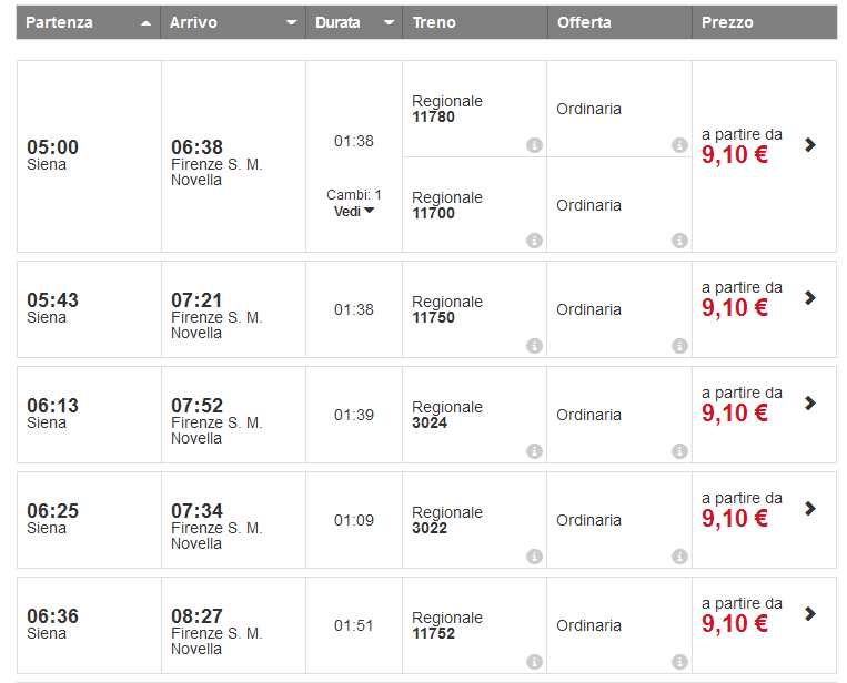 Ниже приведена информация о том, сколько часов вам потребуется, чтобы добраться от Сиены до Флоренции, а также приведена примерная стоимость проезда (средняя цена билета) на том или ином виде транспорта.