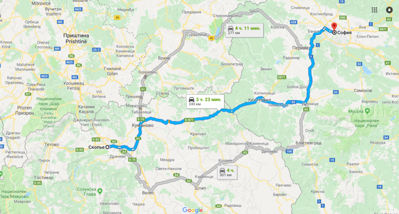 Расстояние между Скопье и Софией составляет 108 километров или 67 миль по прямой и 240 километров или 149 миль по автодорогам.