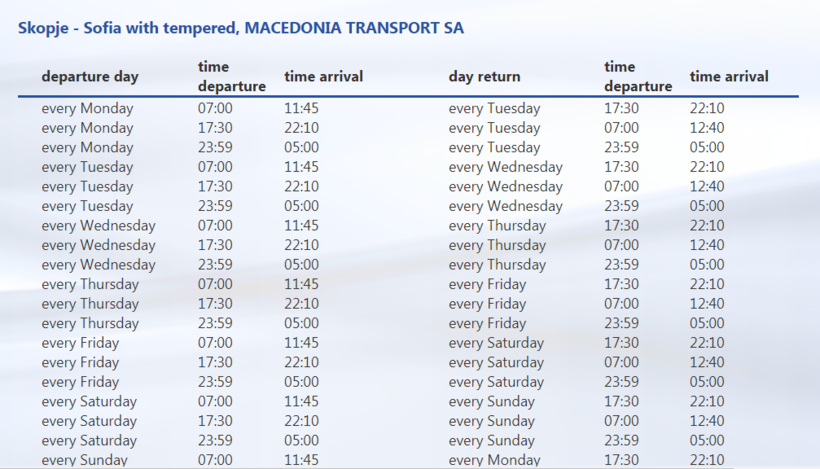 Каждый день есть три прямых рейса до Софии от фирмы Macedonia Transport SA: в 07:00, 17:30 и 23:59. Они отправляются от автовокзала Скопье.