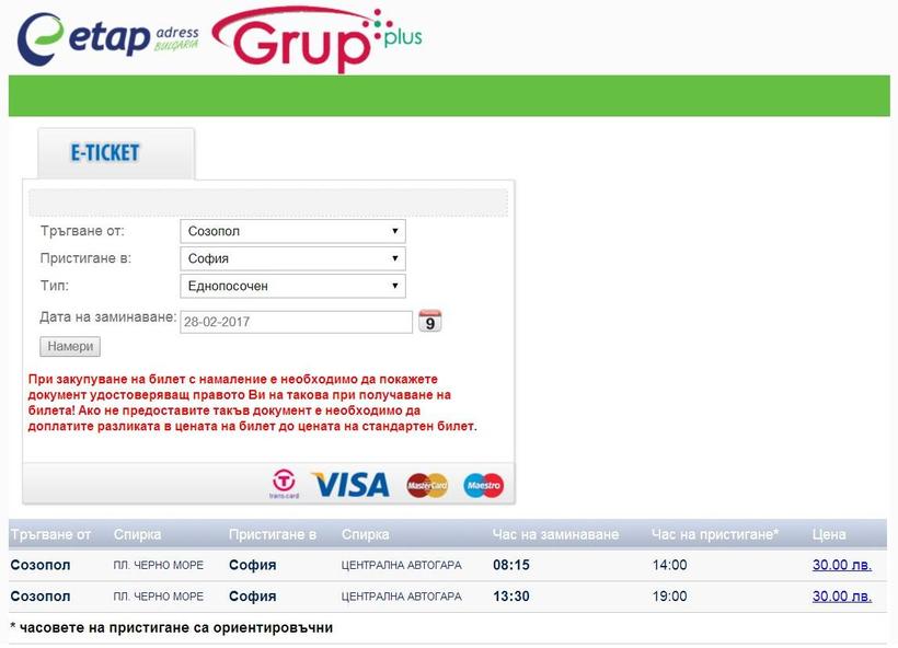 Фирма Etap Group совершает прямые перевозки до Софии дважды в день: в 08:15 и в 13:30. Отправляются автобусы от остановки на площади Черно Море, а прибывают на Центральный автовокзал Софии (бульвар “Мария Луиза”, 100). На дорогу нужно потратить примерно 6 часов.