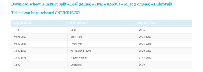 Билеты продаются на сайтах Jadrolinija и Krilo, а также в кассе на причале.