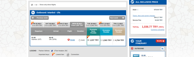 Билет в эконом-класс стоит 1037 турецких лир в один конец (это 267 евро по курсу).