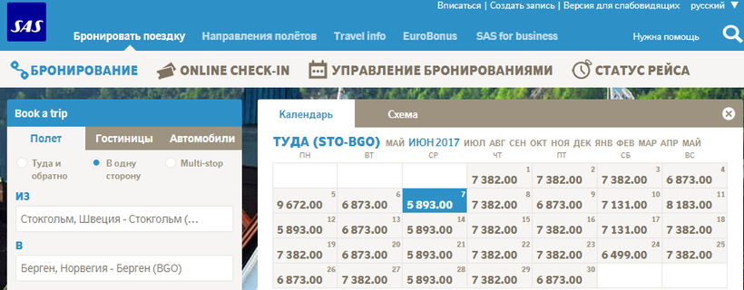 Пример расписания с сайта SAS Из Стокгольма в Берген наземным транспортом