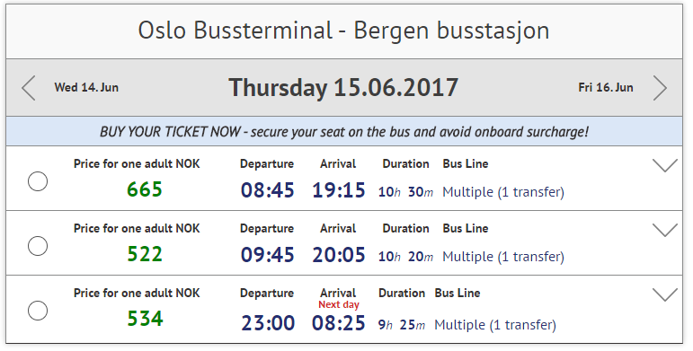 Пример расписания и цен с сайта норвежского автобусного перевозчика Из Стокгольма в Берген на машине