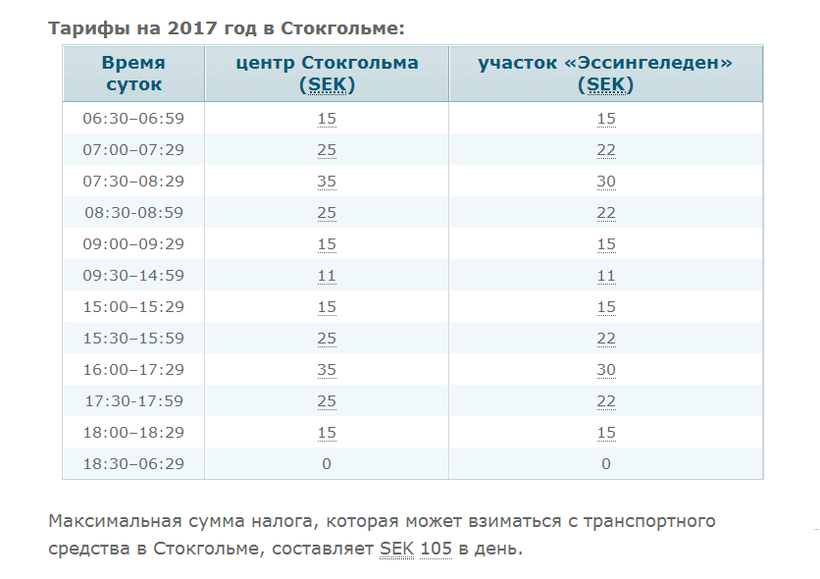 В Швеции большинство дорог бесплатные, но в Стокгольме действует дорожный сбор на перегруженность, который взимается с машин и с местными, и с иностранными номерами. Размер сбора зависит от времени суток, но не может превышать 105 шведских крон (чуть более 20 евро) в сутки.