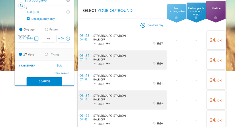 Между французским Страсбургом и швейцарским Базелем курсирует масса электричек. Первый пригородный поезд отправляется с железнодорожного вокзала Страсбурга в 05:15, последний – в 21:18. Интервал движения в течение дня составляет около 30-40 минут, иногда – чуть реже. В дороге пассажирам нужно будет провести чуть меньше полутора часов.