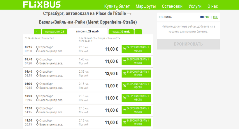 Гораздо дешевле, хоть и немного дольше добираться в Базель на автобусе. Рейсы осуществляет несколько транспортных компаний, но самые выгодные и удобные предложения, как обычно, оказываются у FlixBus. Автобусы отправляются с привокзальной площади Страсбурга несколько раз в день: в 05:15, 05:40, 08:00, 10:00, 12:00, 18:00. В дороге нужно будет провести 1,5-2 часа в зависимости от рейса.