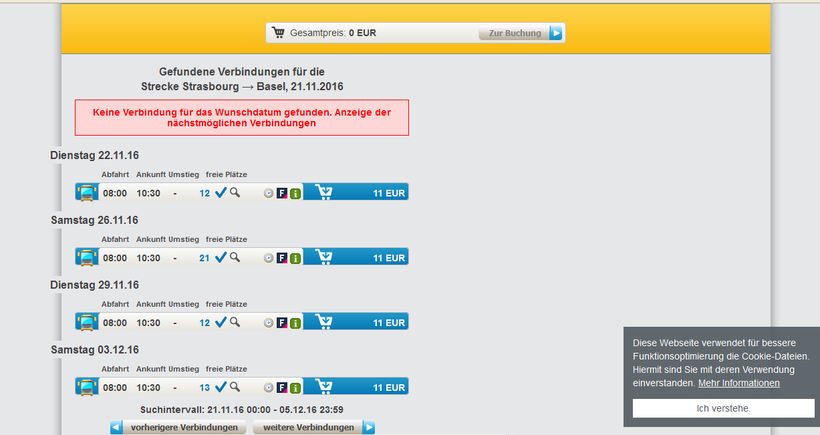Еще одна транспортная компания, которая осуществляет рейсы на данном маршруте, - это Regioje. Неудобством поездки с данным перевозчиком является то, что рейсы Страсбург-Базель не ежедневные (только по вторникам и субботам), кроме того, есть всего один утренний рейс со временем отправления 08:00. В Базель автобус прибывает в 10:30.