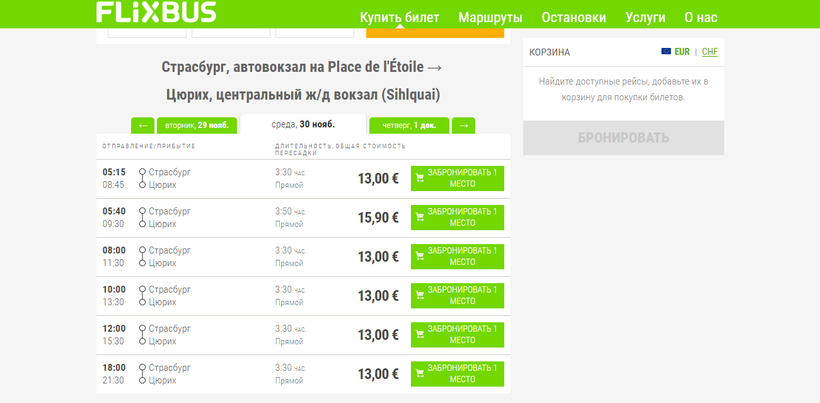 Итак, наиболее бюджетным способом добраться из Страсбурга в Цюрих остается автобус. Лично я предпочла один из утренних рейсов FlixBus. Вариант с автомобилем и поездом я решила не рассматривать из необоснованно высокой цены на проезд.