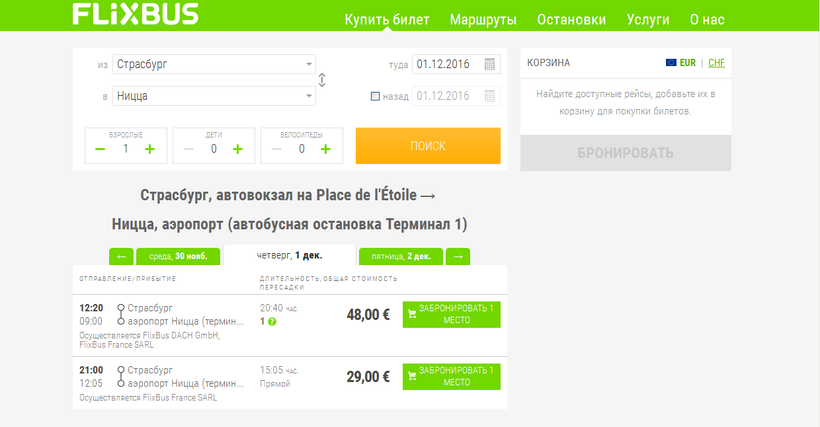 Билет на автобус транспортной компании FlixBus обойдется в 29 евро.