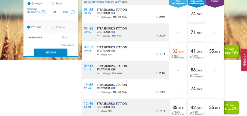 Добраться из Страсбурга в Штутгард можно, но прямых поездов и, соответственно, не очень дорогих билетов немного. Прямые составы выезжают с вокзала Страсбурга в 08:31, 12:46, 15:46, 17:47, 19:47. С пересадкой же выехать в сторону Штутгарта можно с 06:22, правда, и дорога займет больше времени. Если ехать без пересадки, то дорога займет около 1,5 часов, если ехать с пересадками, то потратите часа 2-2,5.