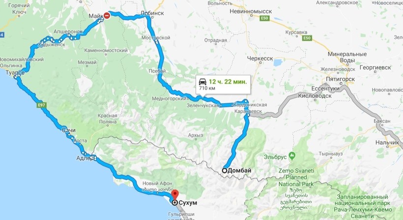 Сухум — Домбай — маршрут на карте
