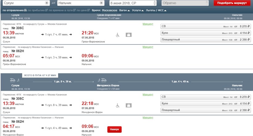 Ну и теперь вариант для туристов без собственных транспортных средств — поезд. Только вот есть одна проблема — ехать придется с пересадкой, поскольку между Сухуми и Нальчиком прямого сообщения нет.