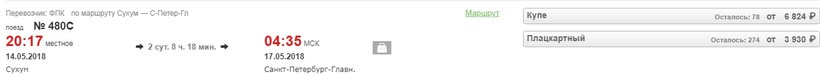Ниже приведена информация о том, сколько часов вам потребуется, чтобы добраться от Сухума до Санкт-Петербурга, а также приведена примерная стоимость проезда (средняя цена билета) на том или ином виде транспорта.