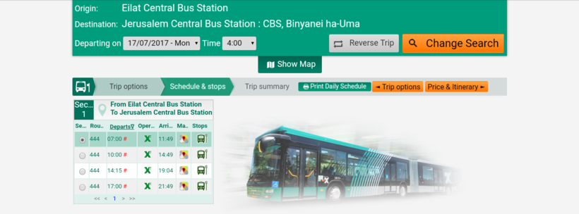 Автобусы Egged ездят в Эйлат каждые полчаса, начиная с 8:30 и заканчивая 21:30. Через 30 минут мы приехали на автостанцию, где пересели на автобус 444 в Иерусалим. Тут автобусов уже не так много, всего лишь 4 рейса:
