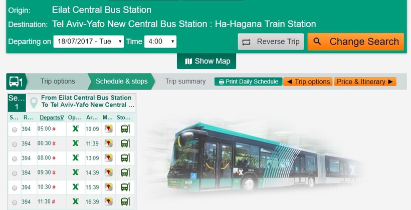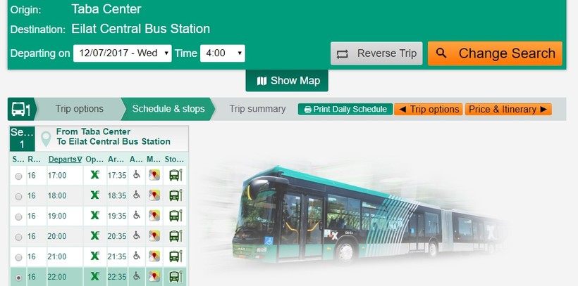 Для путешествия по такому маршруту можно воспользоваться автобусом той же компании, которая обслуживает и маршрут из Табы в Эйлат. На сайте доступен все расписание по такому направлению.