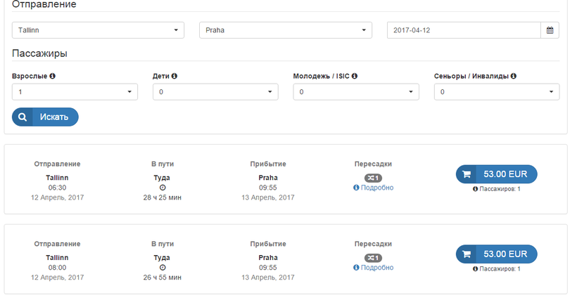 Ниже приведена информация о том, сколько часов вам потребуется, чтобы добраться от Таллина до Праги, а также приведена примерная стоимость проезда (средняя цена билета) на том или ином виде транспорта.