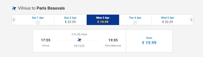 Ryanair перевозит пассажиров в Париж четыре раза в неделю: по понедельникам, средам, пятницам и воскресеньям. Вылет в 17:55, прибытие в 19.35.