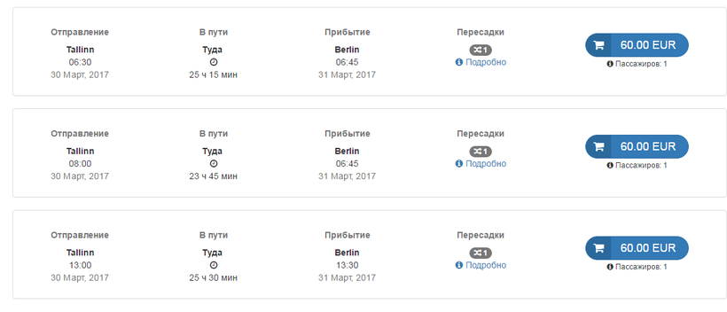 Ниже приведена информация о том, сколько часов вам потребуется, чтобы добраться от Таллина до Берлина, а также приведена примерная стоимость проезда (средняя цена билета) на том или ином виде транспорта.